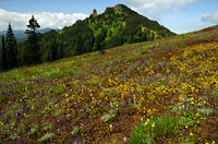 The trail is well-graded with numerous switchbacks, passing by numerous different types of trees. At the sixth switchback you will catch your first glimpse of the wildflower meadows... keep going and your patience shall be amply rewarded! After several more switchbacks, you will find yourself in open meadows littered with penstemon, larkspur, paintbrush, stonecrop. Cone Peak will be directly ahead of you, with Iron Mountain to the west (left) and Echo Mountain to the right.